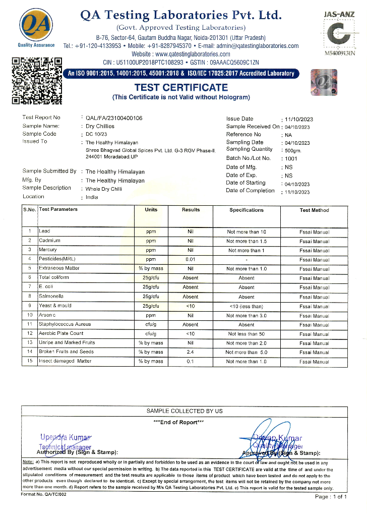 Our commitment to quality starts with on-site visits, allowing us to witness the fresh harvest firsthand. We understand that the journey from farm to table is integral, and by actively participating in each step, we ensure that our customers receive the freshest and finest spices. In addition to personal engagement, we prioritize conducting lab tests to guarantee the purity and quality of our products (see the test results below). This meticulous testing process aligns with our commitment to transparency, giving our customers confidence in the origin and quality of the spices they choose.
